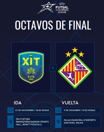 El Illes Balears Palma Futsal jugará el partido de ida de los octavos de final de la UEFA Futsal Champions League frente al Hit Kyiv en el Pálfi István Rendezvénycsarnok Sports Hall, en la localidad húngara de Berettyóújfalu, situada al este del país y muy cerca de la frontera con Rumanía.