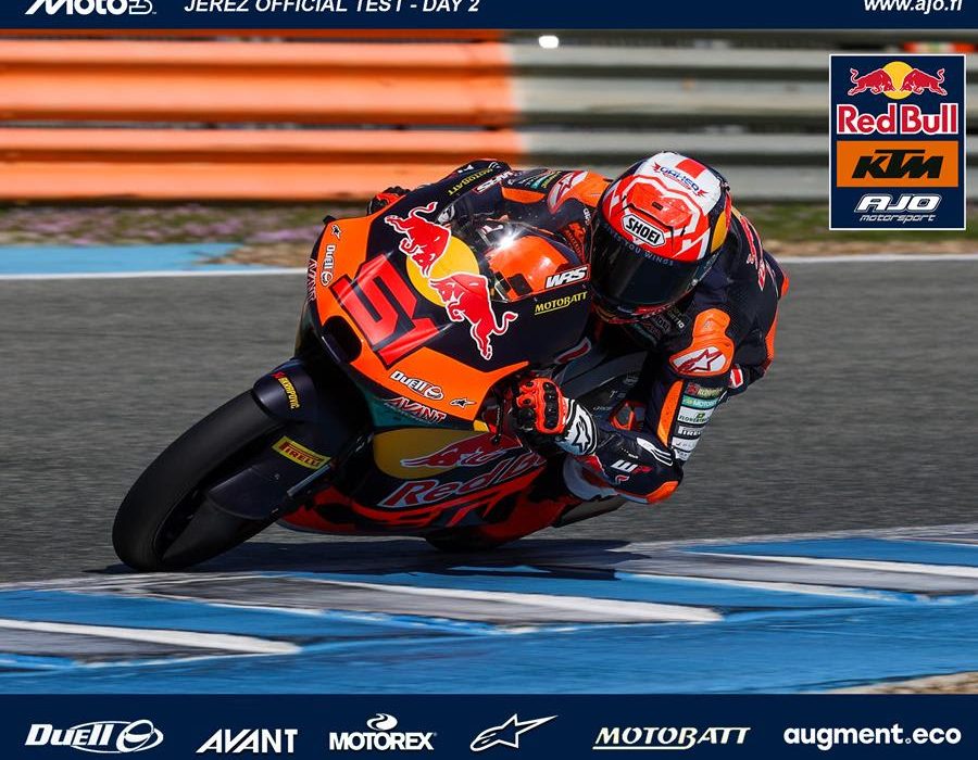 Este domingo se celebró la segunda jornada de pruebas para los pilotos de Moto3 en el Circuito de Jerez-Ángel Nieto, culminando así la pretemporada de los pilotos de Red Bull KTM Ajo en la categoría de menor cilindrada. Álvaro Carpe y Brian Uriarte volvieron a dejar una buena impresión en el circuito español y concluyeron con una gran cantidad de datos recopilados tras dos días de intenso trabajo. Con Carpe en séptimo lugar y Uriarte en decimoctavo, completaron un total de 81 y 74 vueltas, respectivamente, alcanzando un total combinado de 300 durante el Test Oficial de Moto 3