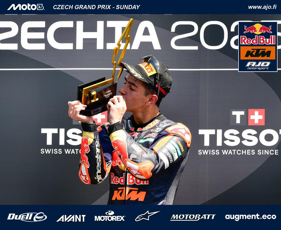 El piloto del Red Bull KTM Ajo de Moto3 se desprendió del grupo principal para alzarse con la victoria en Brno. Carpe no pudo mantenerse en el grupo delantero y terminó 12.º. Automotodrom Brno, República Checa El Red Bull KTM