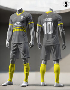 - Camiseta gris con detalles amarillos, disruptiva y diferente a los diseños anteriores.