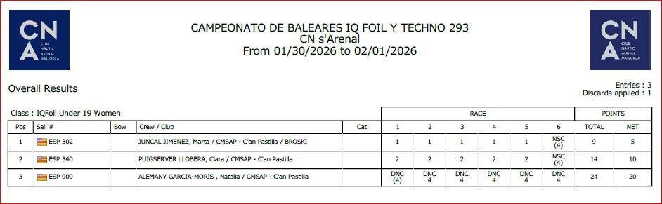 Resultados completos: https://regatas.cnarenal.com/es/default/races/race-resultsall?text=CAMPEONATODEBALEARESIQFOILYTECHNO293-es