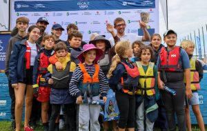 Alumnos y alumnas de la escuela de vela del RCN de Vigo posan con el vencedor Hugo Cardon