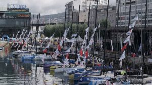 La flota de La Solitaire du Figaro amarrada en la dársena de Portocultura, en Vigo.