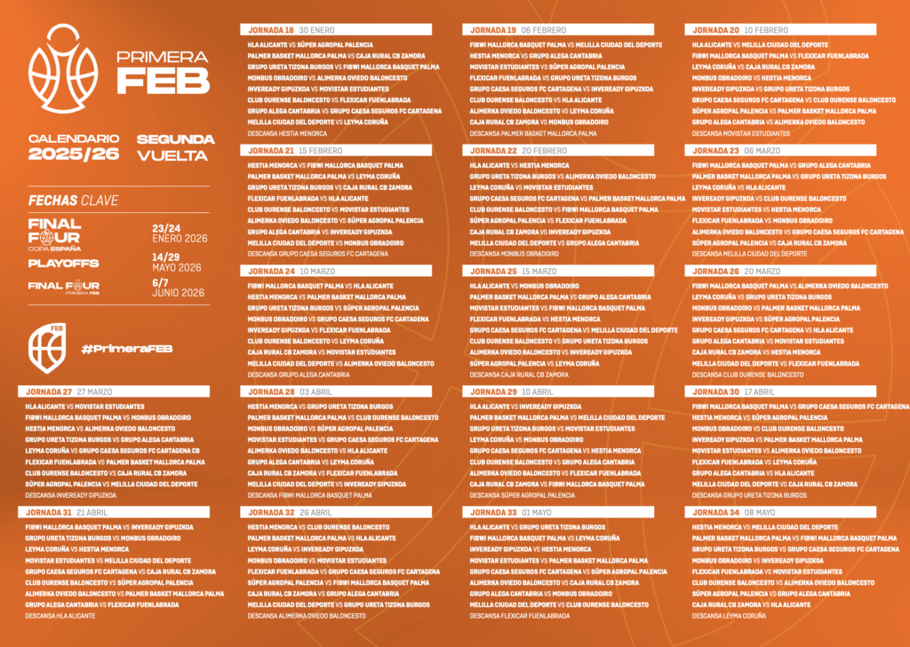 El Fibwi Mallorca Bàsquet Palma ya conoce su hoja de ruta para esta temporada en la que regresará a la Primera FEB. En la temporada de su retorno a la segunda categoría del baloncesto español, el equipo de Pablo Cano comenzará la temporada visitando en el fin de semana del 26 de septiembre al Gupo Caesa Seguros FC Cartagena iniciando asi unas intensas semanas iniciales de competición ya que en la segunda jornada de la temporada jugará ante el Hestia Menorca en el primero de los derbis baleares de esta Primera FEb. En la tercera jornada, el Fibwi Mallorca Bàsquet Palma visitará al HLA Alicante descansando en la octava jornada de competición y cerrando este año 2025 con el derbi ante el Palmer Basquet Mallorca Palma.