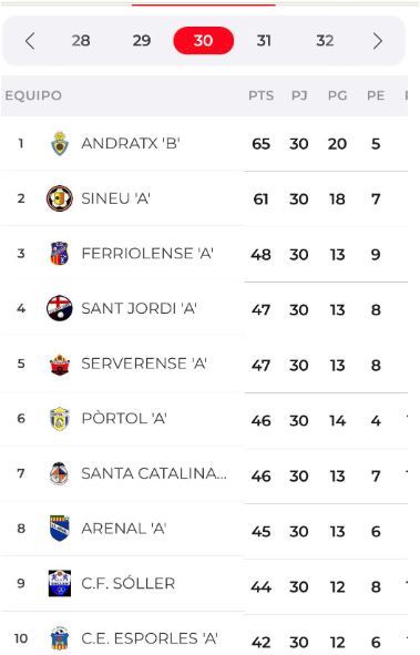 FERRIOLENSE, SANT JORDI, SERVERENSE, PORTOL, SANTA CATALINA AT., ARENAL A, y SÓLLER, más el ESPORLES que tiene DOS MENOS.