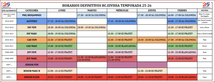 Desde el Handbol Club Eivissa anunciamos con entusiasmo que ya están disponibles los horarios de entrenamiento para todos nuestros equipos de cara a la nueva temporada 2025-26. Desde los más pequeños, en las categorías prebenjamín y benjamín, hasta nuestro conjunto de División de Honor Plata, cada grupo tiene su espacio y tiempo asignado para seguir creciendo, entrenando y disfrutando del balonmano.