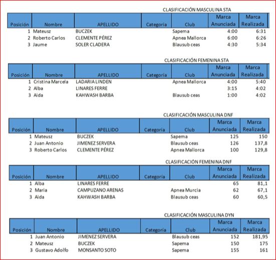 En la parte masculina, dos claros dominadores del campeonato, Juanan Servera y Mateus Bucscek, ambos medallistas en el último campeonato de España de 2025, con victoria para el polaco residente en Mallorca en las disciplinas STA (apnea estática) y DNF (dinámica sin aletas) y por el atleta de Porto Cristo en la disciplina DYN (dinámica con aletas).