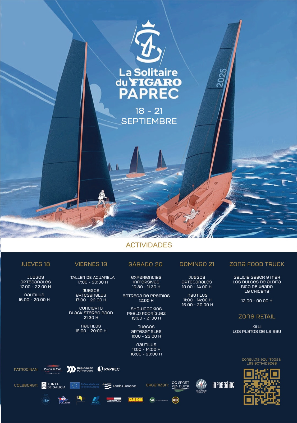 El jueves 18, a partir de las 16:00 horas, comenzarán las primeras propuestas en tierra con zonas de juegos artesanales, talleres interactivos y área gastronómica con foodtrucks. El viernes 19 se espera la llegada de los primeros barcos de la flota, que será uno de los momentos más esperados del evento. La jornada se completará con actividades para todos los públicos, talleres artísticos y el concierto de la Black Stereo Band por la noche.