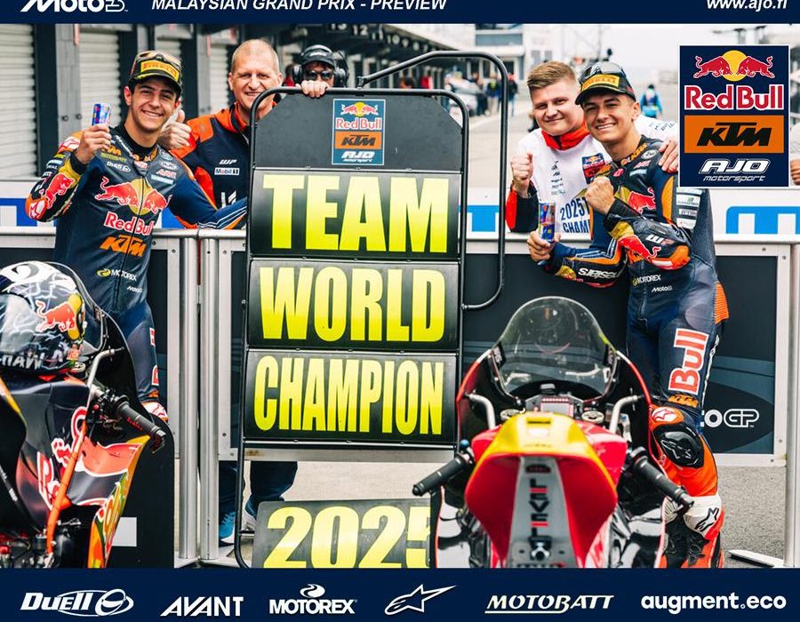 Los resultados de Red Bull KTM Ajo en Australia confirmaron el título por equipos para el equipo, con 538 puntos, 10 victorias y 18 podios en 19 carreras. Su objetivo ahora es el récord histórico de puntos en una temporada, que se sitúa en 576. En las últimas ocho visitas a Sepang, el equipo ha conseguido una victoria y tres podios más: Miguel Oliveira ganó en 2015, tras un doblete con Brad Binder, mientras que Bo Bendsneyder y Rueda fueron terceros en 2016 y 2024, respectivamente.