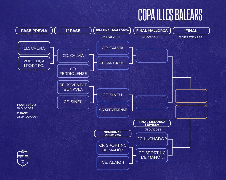 Las semifinales de Mallorca se disputarán el miércoles 27 de agosto. El CD Calvià y el CE Sant Jordi jugarán a las 20.00 horas en el campo de fútbol Es Mofarés. A la misma hora, el CE Sineu y el CD Serverense se enfrentarán en el campo de fútbol Son Magí.