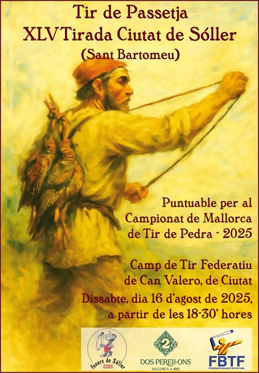 La tradición y la fuerza regresan este verano con la XLV Tirada Ciudad de Sóller – San Bartolomé, prueba puntuable para el Campeonato de Mallorca de tiro de piedra. El evento se disputará el sábado 16 de agosto de 2025, a partir de las 18:30 horas, en el campo de tiro federativo de Can Valero, en Ciutat.